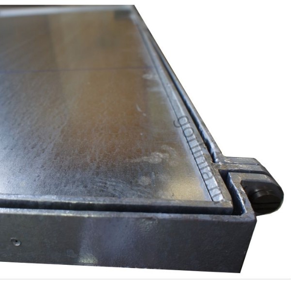 Рама исполнена из сортового уголка 50х5. Каркас двери с внешним кантом сварен с обвязкой профилем 50х25 с ячейкой в осях 300х300. Дно крышки закрыто оцинкованным листом 2 мм клепочным соединением с расчетной глубиной под настил декинга.