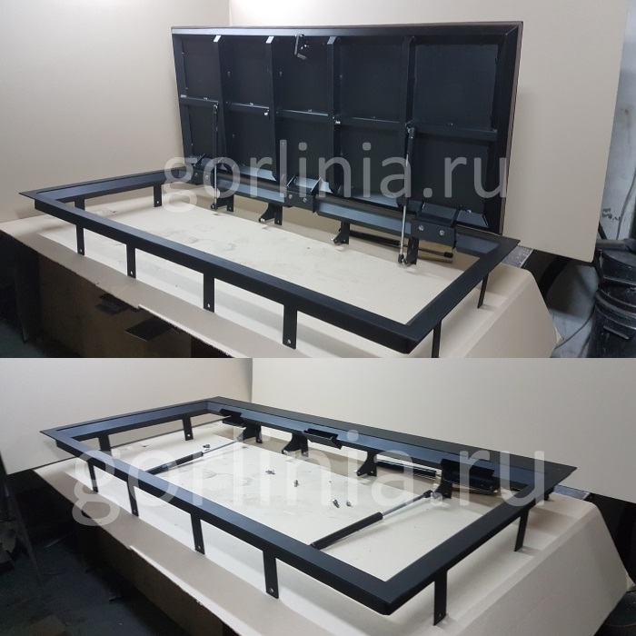 Объемное соединения марок уголков 63х40, 40х40 в раме многократно увеличивает несущую способность крышки в гараже (принцип элерона крыла самолета). Дверца в обвязке из уголка 40х40, профиля 50х25, 30х30 обшита металлическим листом «чичевица» толщиной 3 мм, окрашена порошковой эмалью.