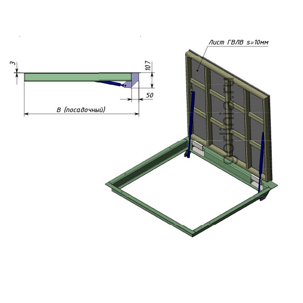 Облегченная модель в заказном размере без щелей в полу с уведенными за ось открывания петлями по длине 700. Легкая ходовая часть и удобная установка. При формировании конфигурации напольного отверстия обратите внимание, что защитные кожухи шарниров выходят за посадочную отметку по плечевой стороне 800.