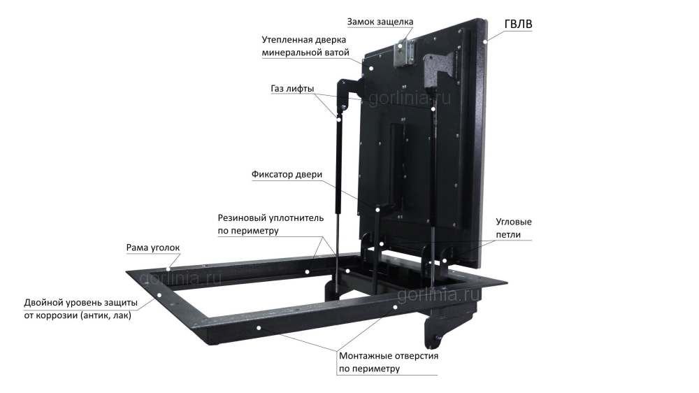 В закрытом положении дверка опирается на трубу 15х15 по трем сторонам, по петлевой держится на осях подшипника шарниров. Уплотнитель проложен по четырем сторонам. Снизу щель над петлями закрыта специальным поддоном для предотвращения тяги из подвала.